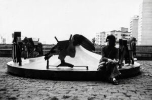 En los años noventa, esa mirada se tensó por un nuevo desafío: cómo representar el caos y el dolor que producían las transformaciones de la violencia. Esta inquietud la llevó a construir escenas densas, donde planos múltiples se superponían y los referentes se mezclaban hasta rozar el collage pictórico. Obras como Entierro en el Museo Nacional (1991), Descendimiento con Palma Bayoneta (1992) o Contrapaeces (1996) muestran figuras que entran y salen del cuadro, temporalidades que coexisten sin jerarquía y fragmentos que generan composiciones deliberadamente inquietantes. El orden espacial que había caracterizado su etapa anterior cedió ante una estructura más abierta, capaz de sugerir simultaneidad, confusión y ruptura.