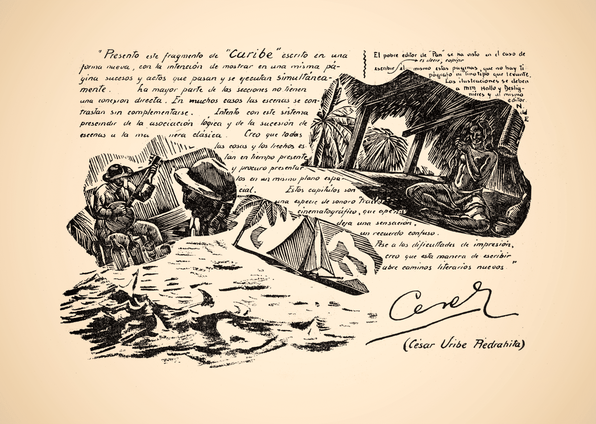 Uribe Piedrahíta llevó estas mismas inquietudes al que sería el último de sus empeños literarios: la novela Caribe (1937). Ya en sus dos primeras obras de ficción había incorporado elementos visuales que deben leerse como parte constitutiva de los libros y no como meros adornos. En Toá incluyó dibujos propios y de Alberto Arango Uribe, así como un par de fotografías cuyos autores se desconocen. En Mancha de aceite, en cambio, ensayó —junto a los maestros tipógrafos de la Editorial Renacimiento— un singular diseño del cual formaban parte orgánica los grabados en madera de Gonzalo Ariza.