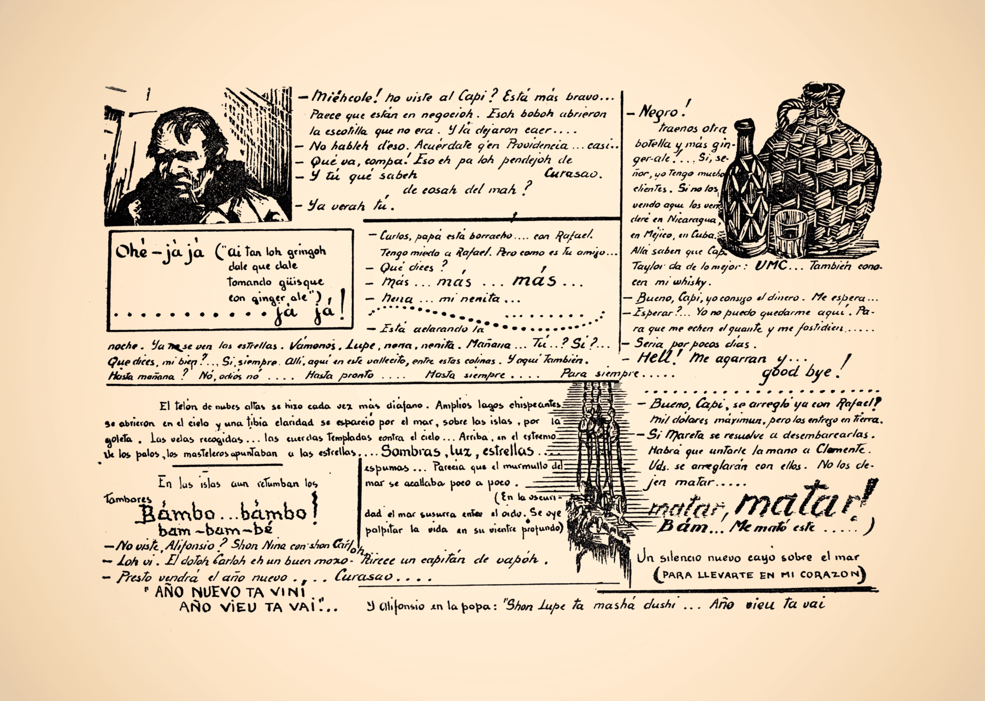 Sin embargo, el paso más arriesgado lo dio en la inconclusa Caribe. Con la ayuda de Enrique Uribe White, director de la revista Pan, elaboró un texto que no solo carece de antecedentes en la literatura colombiana, sino que puede considerarse uno de los primeros ejemplos en el país de lo que hoy llamaríamos una novela gráfica. Los procedimientos que antes había ensayado de manera aproximativa adquieren aquí pleno protagonismo: la acción se desarrolla en planos temporales simultáneos; la caligrafía cambia de tamaño para volverse expresiva —como si buscara reproducir la experiencia del sonido en las salas de cine—; y la narración incorpora imágenes impresas que dialogan activamente con el texto.