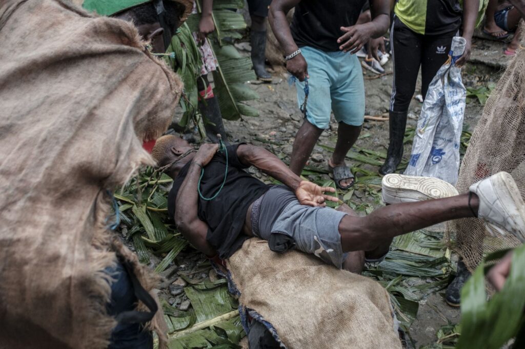 Saliendo del agua, los manacillos suben de nuevo al pueblo y se arrodillan ante la procesión, que pasa –junto con las viejas imágenes talladas de Cristo y San Juan– por encima de sus cuerpos, tumbados en la entrada de la iglesia en señal de rendición. «Van de rodillas, llorando, porque se dan cuenta de que Cristo, al que crucificaron, era verdaderamente el hijo de Dios», dice el líder social Angulo. Entre lágrimas, los manacillos cuelgan sus máscaras, se despojan del traje y bailan con el repique de la campana en el interior de la iglesia. Vuelven a sus identidades, el pueblo los acoge de nuevo, ahora pueden descansar.